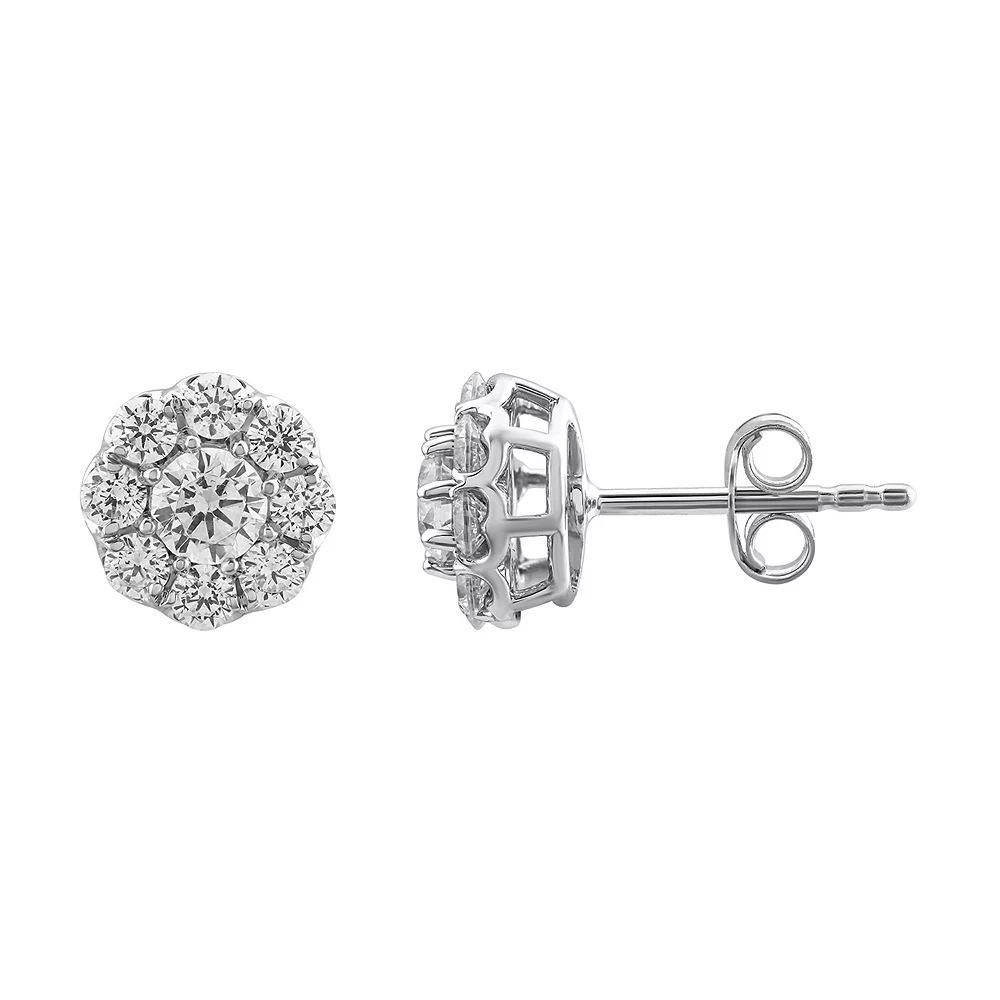 Decorated with clusters of round-cut diamonds, these 10k white gold stud earrings deliver a dazzling look.