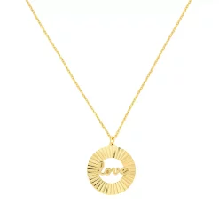 Express your love with this 14k gold necklace. It features a polished script “love” in a radiant disk suspended from a cable chain that can be worn at 16 in. or 18 in. Wear it alone or layer with other chains for your unique look.