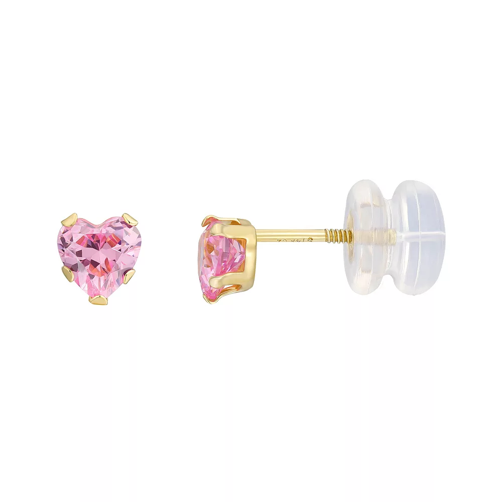 Featuring pink, heart shaped cubic zirconia gemstones, these 14k gold stud earrings will make your little girl feel like a princess.