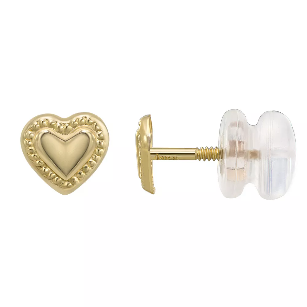These Charming Girl heart-shaped 14k gold earrings are sure to brighten her day.