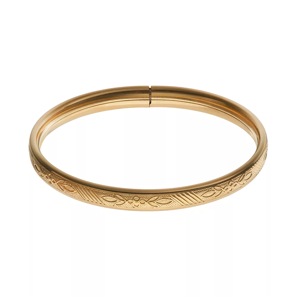 Decorated with an ornate floral motif and textured detailing, this 14k gold-filled bangle bracelet adds a beautiful touch to her outfit.