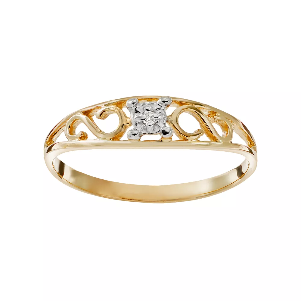 Adorned with scrollwork detailing and a diamond accent, this 14k gold ring exudes ornate appeal. Comes in a gift box.
