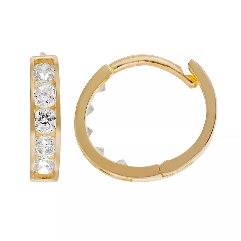 Adorned with shimmering cubic zirconia stones, these hinged 14k gold hoops will make your child shine. Comes in a gift box.