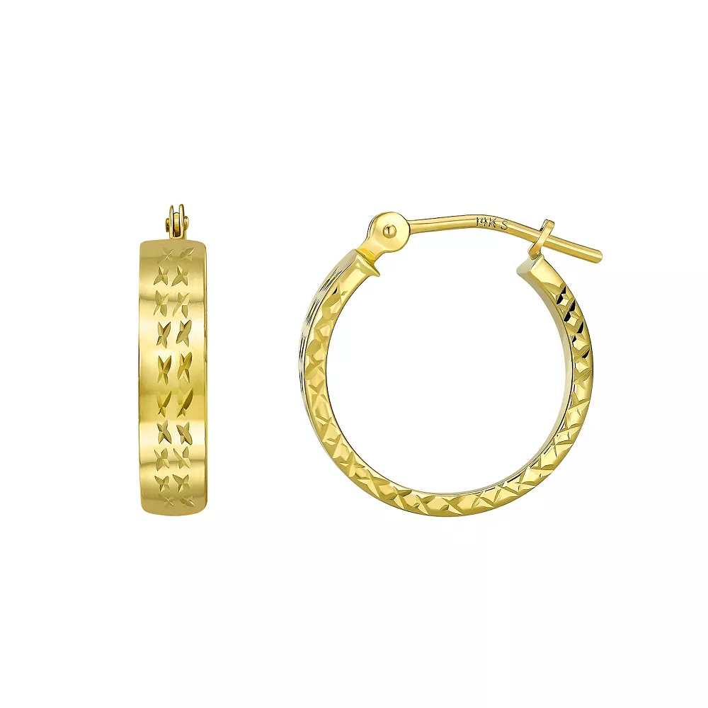Shimmering diamond-cut details lend eye-catching style to these 14K gold hoop earrings.