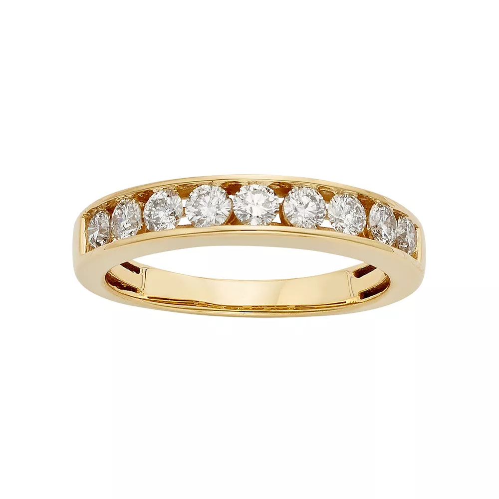 A row of channel-set, round-cut IGL certified diamonds gives this 14k gold wedding ring scintillating beauty that’s sure to make her heart skip a beat.